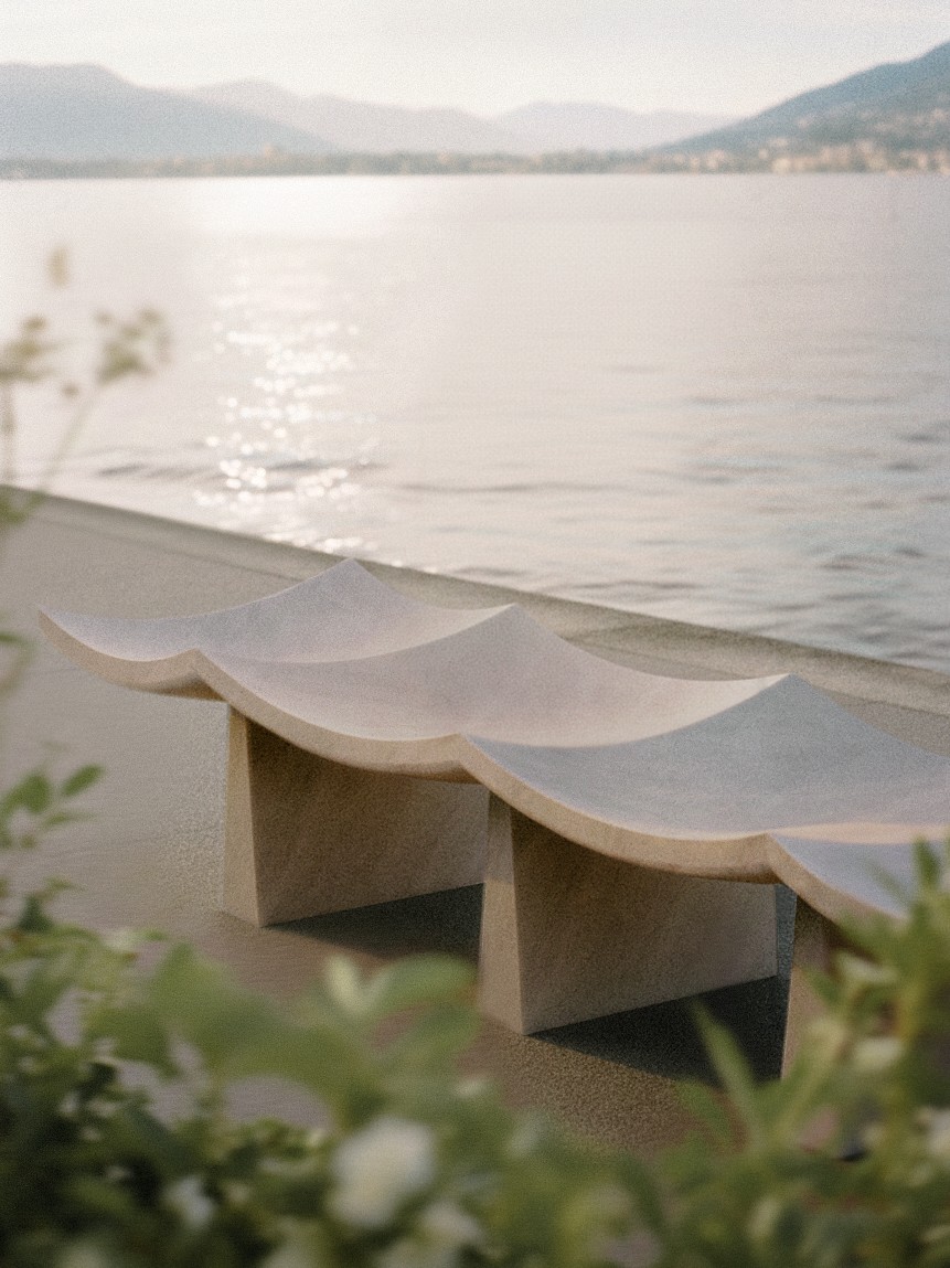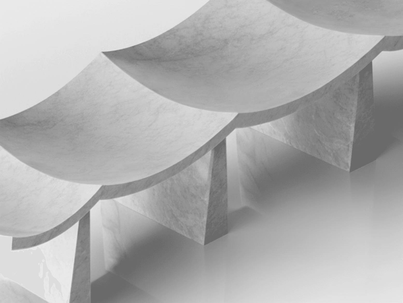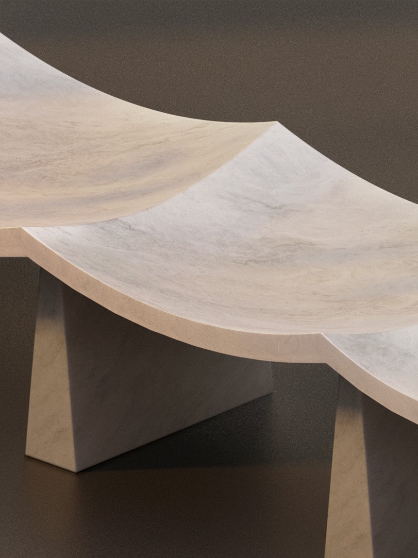 This project draws inspiration from the lakes in Switzerland. Marble is typically viewed as a rigid and heavy material, but Drift alters this perception through its bench designs for the home/urban setting. Drift Urban brings the essence of the dynamic waves into the bustling urban life. The bench’s carved, scalloped form brings softness to the hard marble. The sharp edge treatment and weighted triangular supports allow the bench to fit well into its urban surroundings. Design Proposal — ECAL × Cristallina Marble