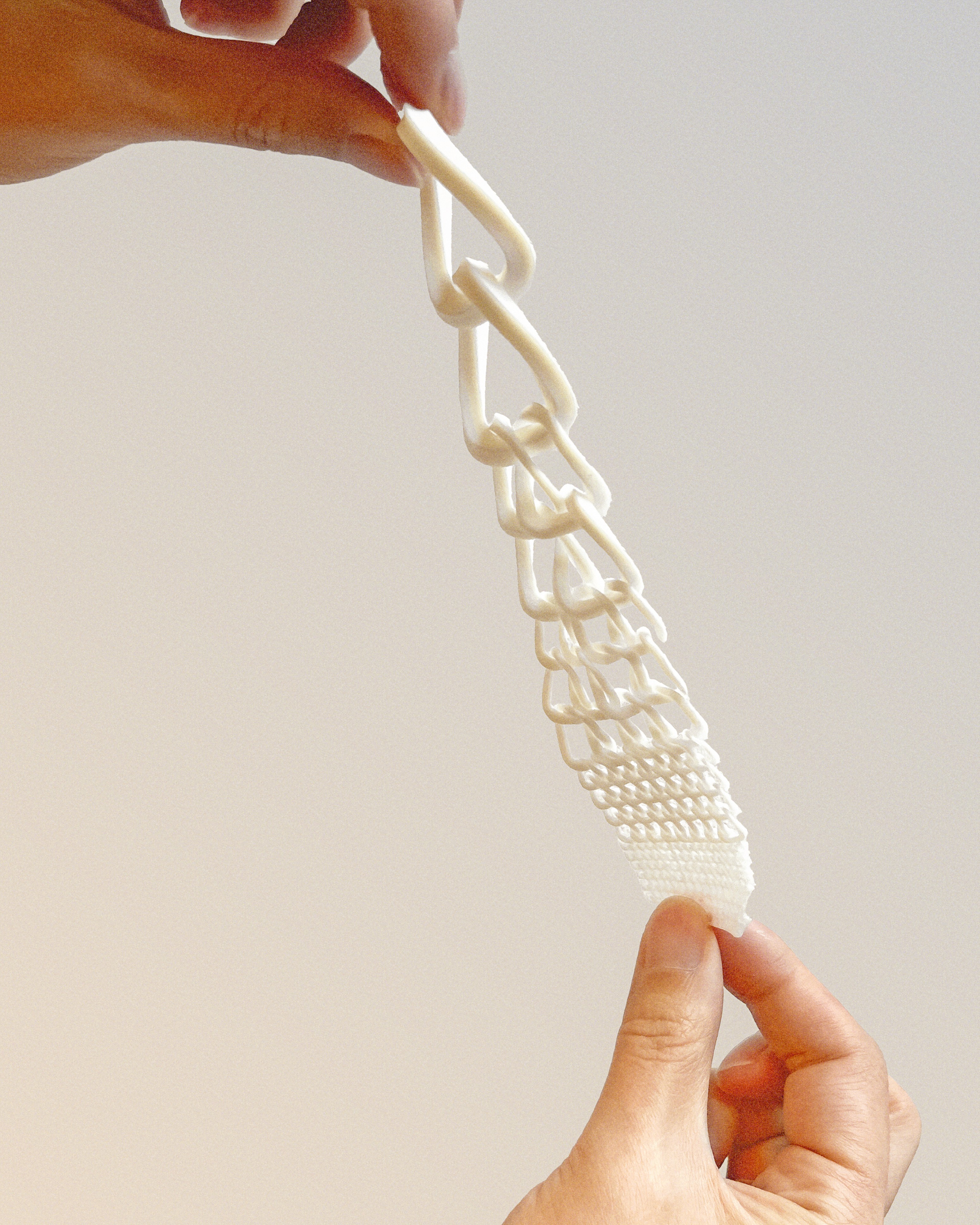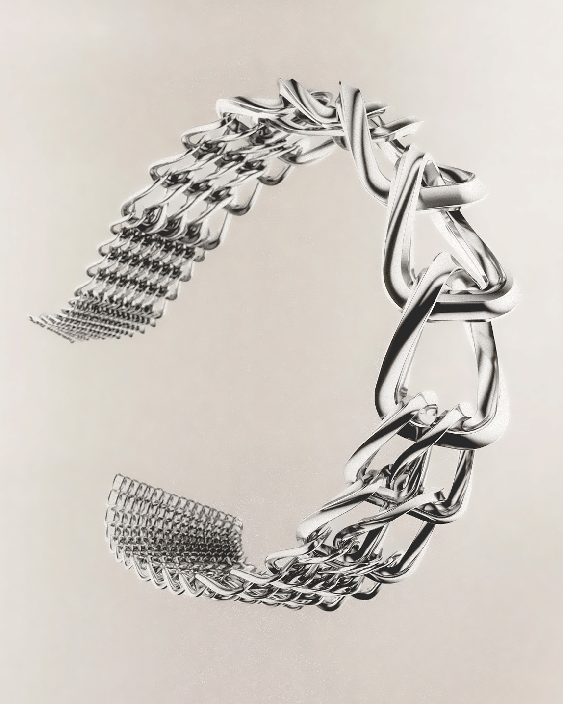 Dyad is a 3D-printed titanium watch bracelet that blends the classic chain and mesh types into a new hybrid expression. The design is a 2-sided bracelet that evolves from a coarse chain to a fine mesh. This creates a sculptural form that evolves from a 3-dimensional element to a flat strap. Like having two personalities, the chain side is more edgy and expressive, while the Mesh side is more conservative and understated. The user can decide which way to wear it according to the occasion. ECAL × Alloyed × Watches & Wonders