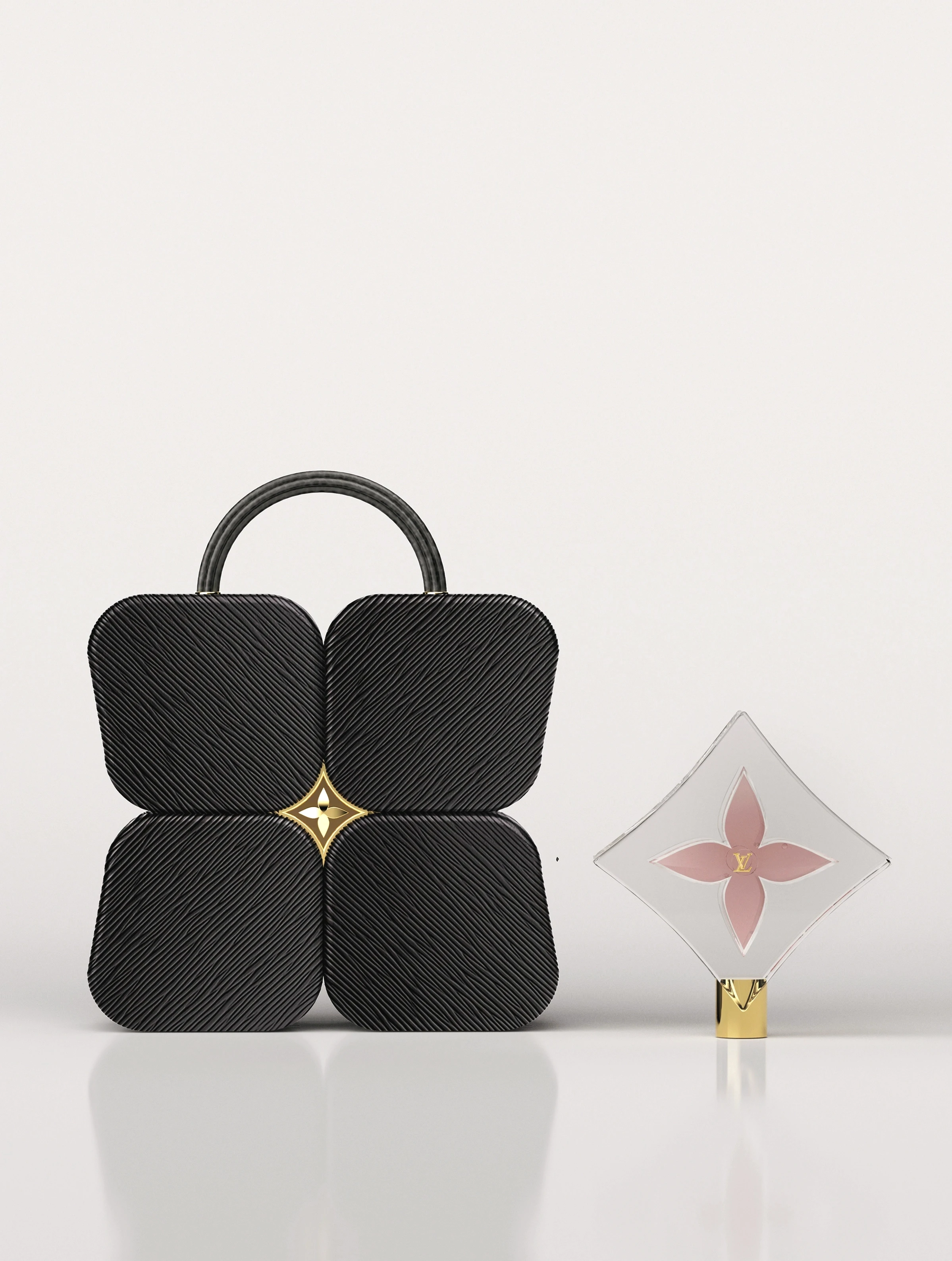 ÉLEVÉ is a reimagined perfume bottle and leather case for women. Inspired by Shiro Kuramata’s Sealing of Rose, the liquid perfume is suspended within the bottle like a captured bloom. Shaped in Louis Vuitton’s iconic floral form, each scent reveals a different colored liquid, creating a collection of vivid flowers. The leather case, derived from the Damier pattern, is reshaped into a floral silhouette.While the name represents the elevated flower within, it was inspired by the ballet movement called élevé, when a dancer stands up on pointe.