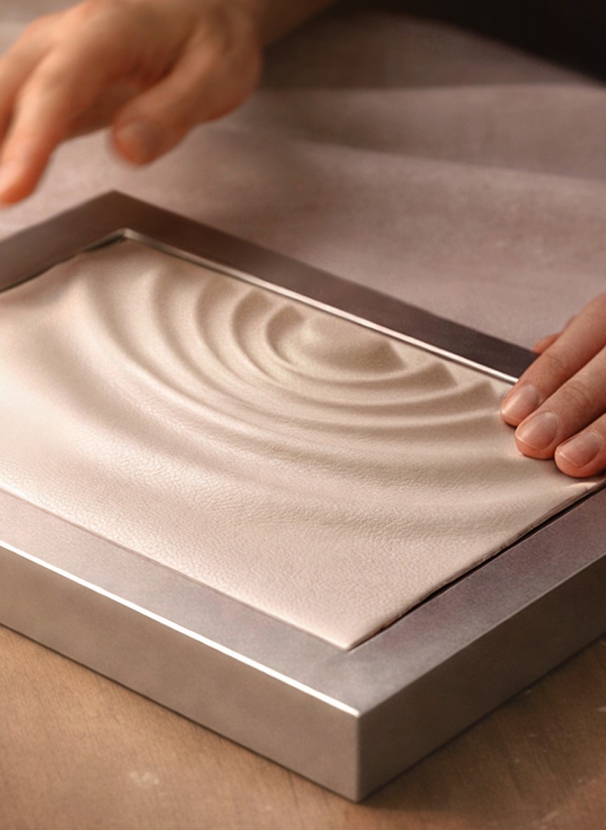 Ripple is a collection inspired by the Pebble hardware and the quiet motion of ripples across water. The form captures soft concentric circles that gradually dissolve across the surface, expressed through sculptural leatherwork using wet-molding techniques. The design is shaped to feel natural and satisfying in the hand, emphasizing tactility through surface and form. Independent speculative project